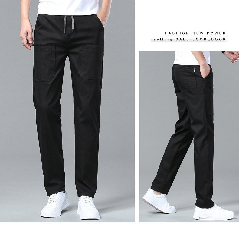 남자 여름 캐주얼 팬츠 작은 일자 아이스 원단 고탄력 팬츠 디자인 남자 데님라이크 6포켓 밴딩 허리 얇은 캐주얼 팬츠
